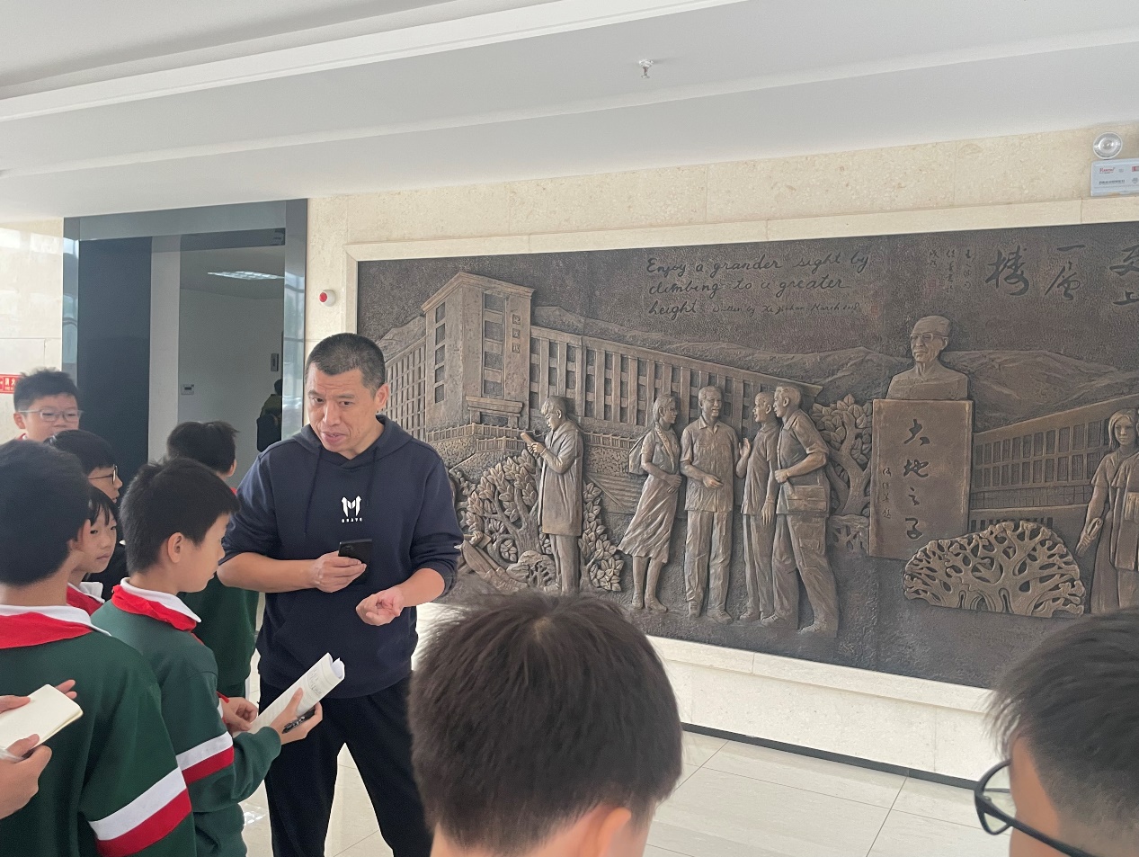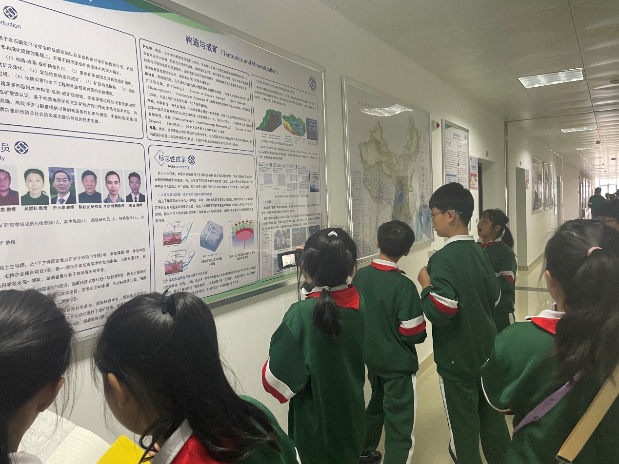 在刘老师带领下,同学们首先在科学家精神长廊处倾听著名地质学家李四光、陈国达以及中国工程院院士何继善爷爷的故事。同学们听得聚精会神,深刻的体会到了老一辈地质学家吃苦耐劳、勇于创新的精神。