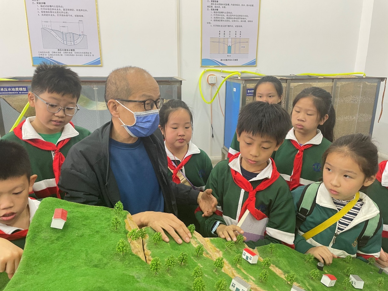 随后同学们来到了水文地质实验室,在匡老师的讲授下,同学们了解了典型地质灾害的成因和危害,引导孩子们保护地质环境。最后小朋友们跟随刘老师来到了钻探工程实验室,了解了深地钻机的结构及工作原理,刘老师实际操作钻机,让孩子看到了模拟采集地球深部岩心岩样的过程。