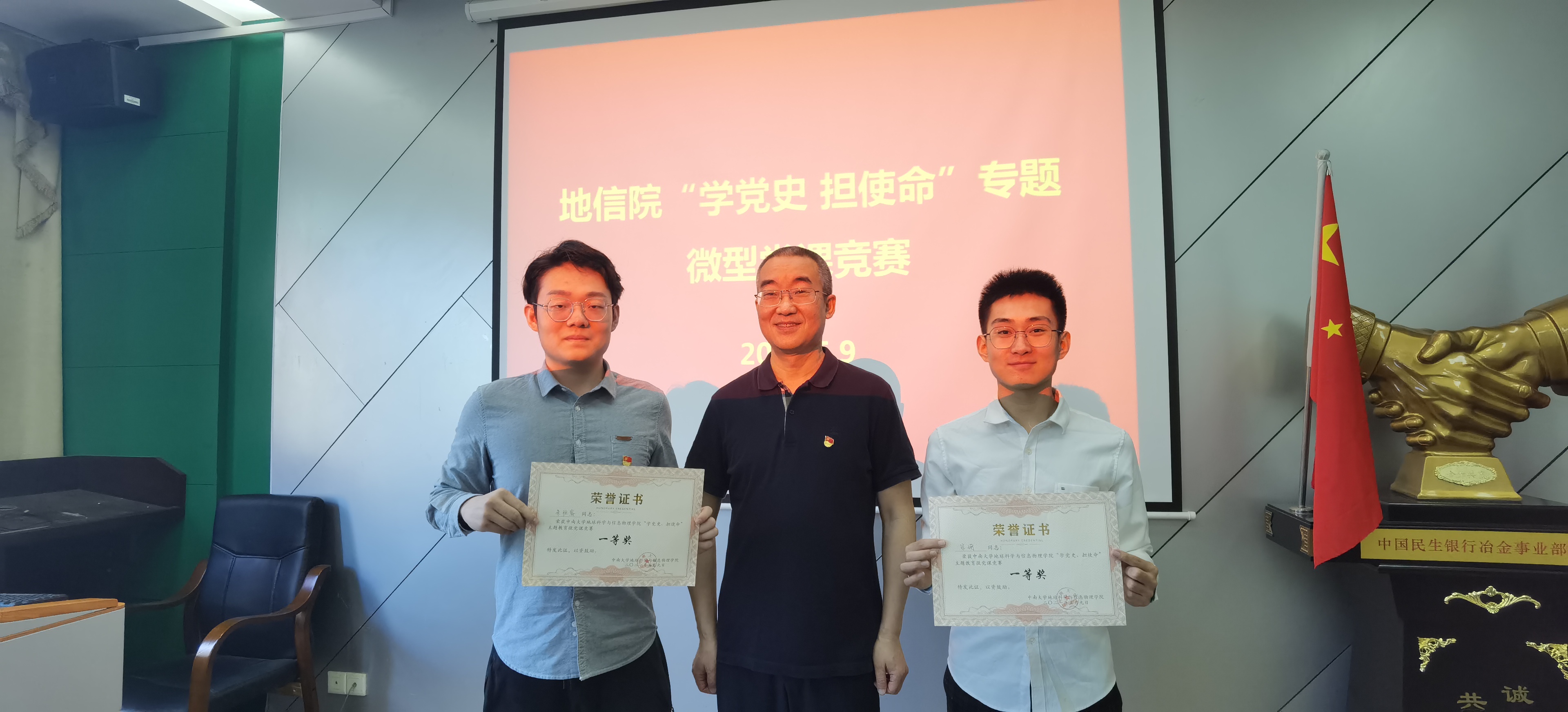 经过分数统计、核算,院党委副书记李建军同志宣读了比赛的获奖结果,向获奖的同志们表示了充分肯定与诚挚祝贺。她指出,本次活动中选手们赛前准备充分,授课内容精彩多样,讲解过程声情并茂,较为全面地向听众们展现出了党史故事背后蕴含的精神力量。紧接着,邵拥军同志、李建军同志、胡祥昭同志、匡华凌同志分别为获奖的选手颁奖并合影留恋。至此,地信院“学党史 担使命”专题微型党课竞赛决赛圆满结束。