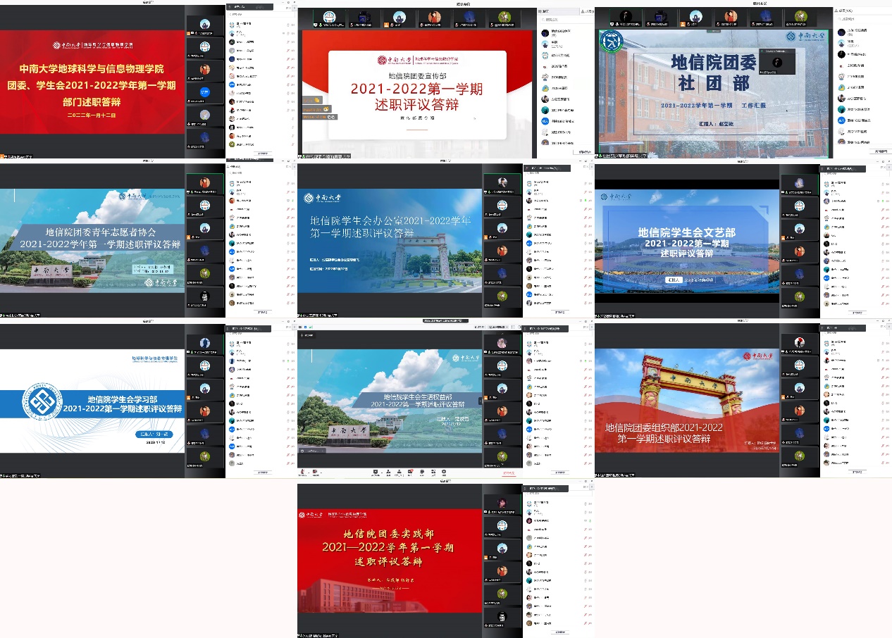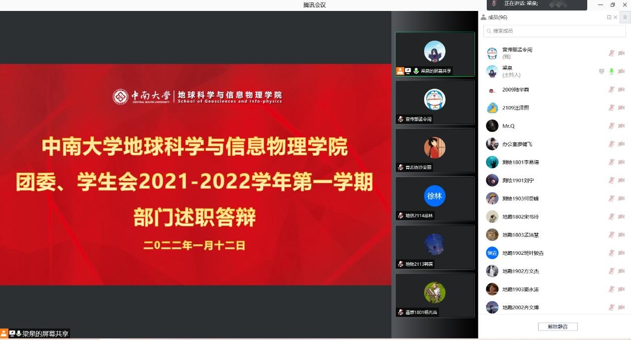 团委、学生会2021-2022学年第一学期部门述职答辩于腾讯会议以线上方式顺利举行。院党委副书记李建军老师,院研究生会指导老师、研究生辅导员田可老师,院团委书记、21级辅导员刘琦老师,院18级辅导员强俊老师及院20级辅导员杨晨雨、杨通田老师出席本次会议。会议由院团委、学生会主席梁泉同学主持,院团委、学生会各部门部长做学期工作述职评议答辩,院各年级88名学生代表参与评议。