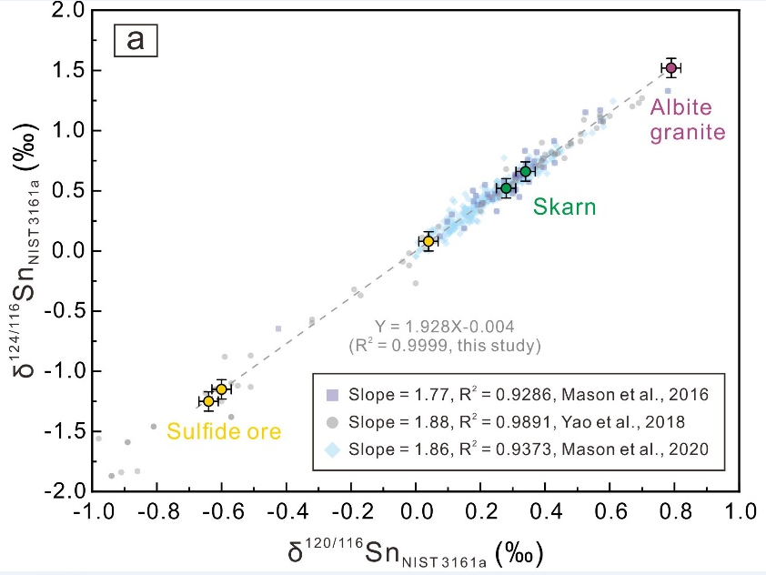 (1)锡同位素储库的首次表征:由于锡具有多达10个稳定同位素,且分析测试时采用的标样有所差异,故国际上各研究团队在锡同位素组成的表示方法上均有所差别,如δ124/120Sn SPEX、δ122/118Sn IPGP、δ124/116Sn NIST3161a、δ120/118Sn NIST3161a和δ120/116Sn NIST3161a等。因此,尚未统一的锡同位素表示方法极大地制约了锡同位素在各领域的进一步应用。本研究提出了一种数学处理方法,将世界范围内已报道的各地质体及历史文物中锡同位素组成统一表示为δamuSn NIST3161a,并首次系统化表征了各地质储库的锡同位素间的差异,使得锡同位素示踪成为可能(图1)。
