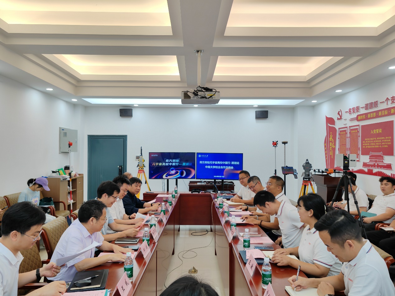 郭宝宇一行与学院领导和教师进行了座谈。学院院长李志伟教授、副院长胡俊教授、南方测绘集团中南技术中心总经理(湖南分公司总经理)邓万军、集团教育事业总工寻林辉,以及测绘与遥感科学系邹峥嵘教授等相关教师和南方测绘集团相关技术人员参加了座谈。会议由测绘与遥感科学系主任杨泽发教授主持。