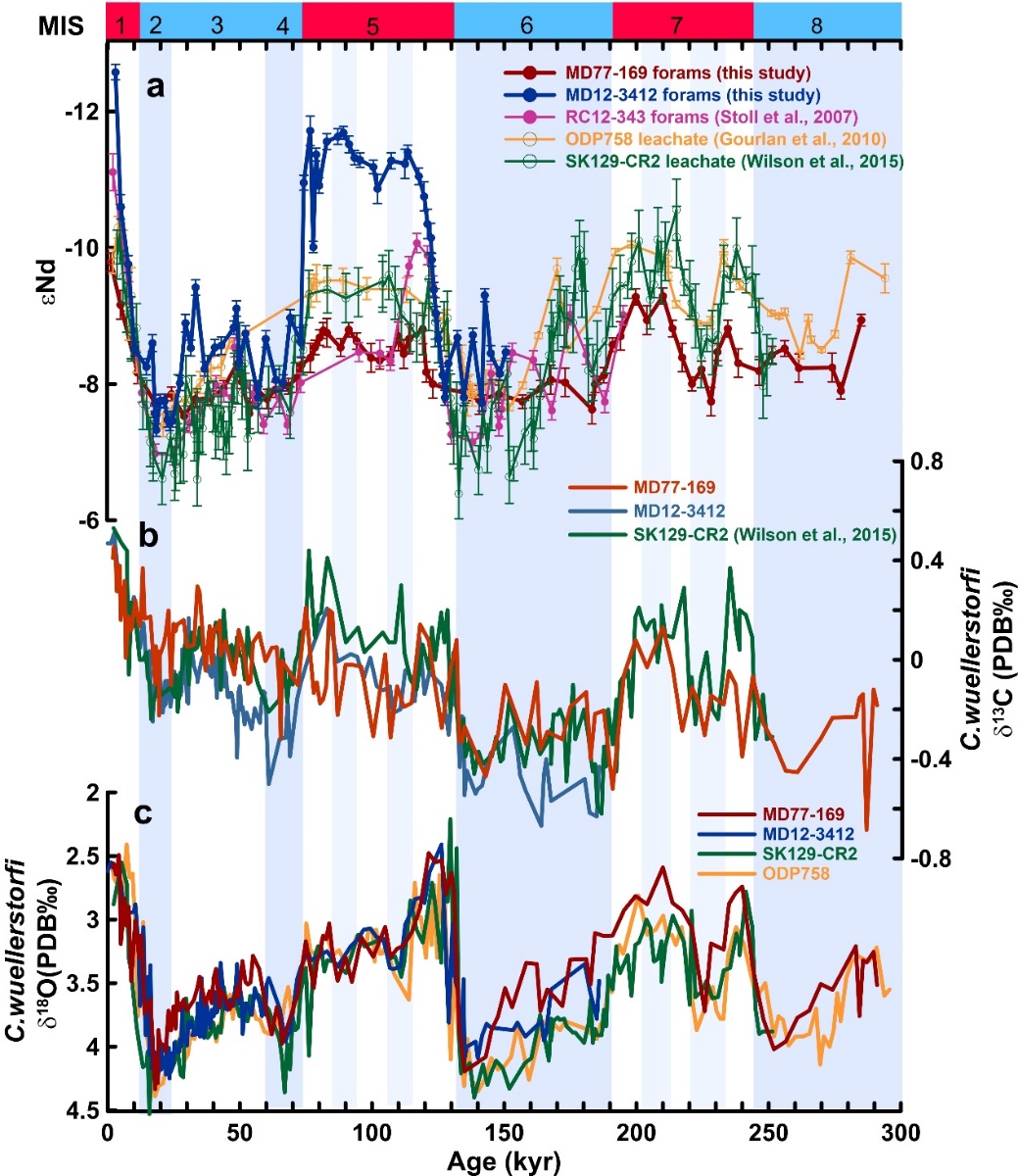 、巴黎萨克雷大学、法国环境与气候研究所、中科院海洋研究所、伦敦大学、法国海洋开发研究院的科研人员基于孟加拉湾及安达曼海的沉积岩芯(图1)中底栖有孔虫碳、氧同位素及浮游有孔虫的钕同位素组成,重建了北印度洋最后两次冰期旋回中古海水Nd同位素值的长期演变进程(图2)。探花社区