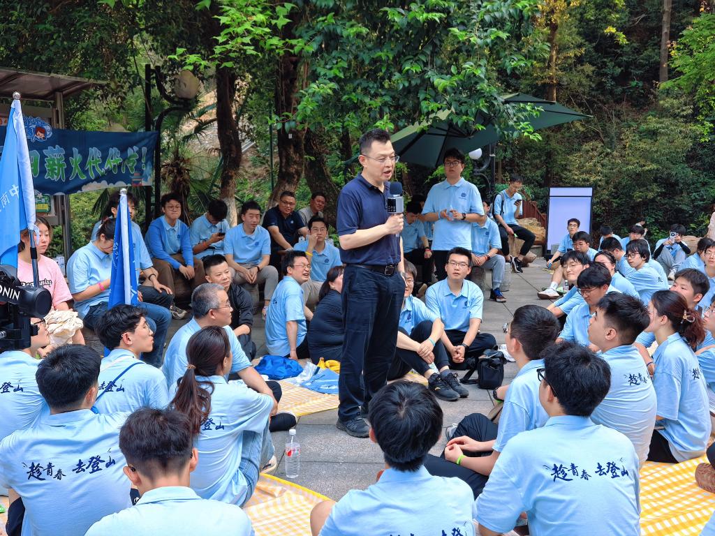 岳麓山校区升旗台前,李建成发表动员讲话,与师生代表共同列队,进行登山热身。热身运动结束后,大家于阶梯处集结,伴随着“趁青春,去登山”的口号,本次登山之旅正式开始。