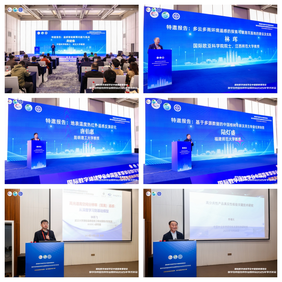 开幕式后,大会进入特邀报告环节。龚健雅院士以“遥感智能解译问题与挑战”为题,林珲院士围绕“多云多雨环境遥感的探索与赣港双基地的建设及实践”展开分享,唐伯惠、陆灯盛等专家也分别就地表温度热红外遥感反演、中国桉树年龄及生物量估测制图等研究成果进行汇报,为参会者带来前沿学术盛宴。本次年会还设置8个平行分论坛,涵盖热带亚热带环境与生态遥感、灾害遥感、农林遥感、城市遥感等关键领域,为跨学科交流与合作搭建了高效平台。10月26日上午,年会闭幕式在会议中心罗马厅举行。闭幕式上,钟燕飞教授和李增元研究员深入探讨了双高遥感在深度学习与基础模型融合应用中的技术突破与发展趋势,并分享了在高分遥感产品精度验证方面的创新方法与实践经验,对提升遥感数据应用可靠性具有重要价值。