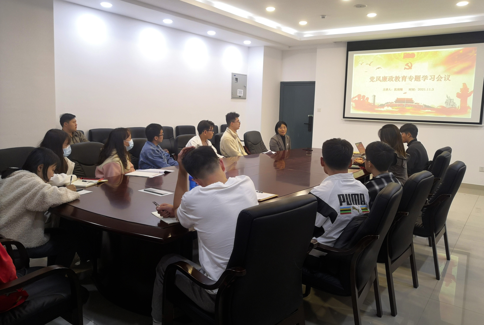 会议伊始,全体支部同志共同学习了党风廉政教育的相关内容。包括了解纪检委员的职责、深入学习《关于严肃换届纪律加强换届风气监督教学讲座》、《完整解读2021关于加强对一把手和领导班子监督的意见》、《中国共产党纪律处分条例》(修改版)等文件精神。接着,由沈羽翔同志传达了学校纪委召开的警示教育大会精神,大会指出,要高度重视党风廉政建设工作,大力推进反腐败斗争,加强反腐办案的力度和对案件的曝光度,以案促改,以案促建,坚决做到零容忍、高压反腐,全面落实从严治党,锲而不舍营造风清气正的政治生态。