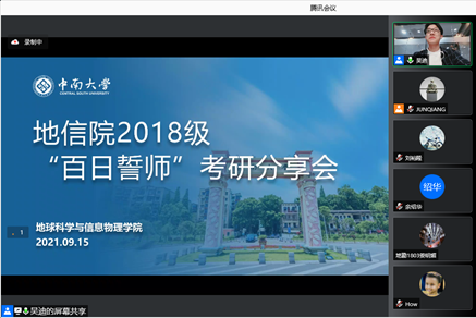 在距离考研百日之际,为帮助18级考研同学做好最后阶段的考研学习,充分准备、积极备考,9月15日19时,地信院2018级百日誓师线上考研分享会顺利举行顺利举行。分享会由上海云骥教育科技有限公司创始人、总经理、地质工程系杰出校友吴迪主讲,地信院党委副书记李建军老师出席会议,2018级辅导员强俊老师、何可沁老师以及考研同学参加会议。会议由强俊老师主持。