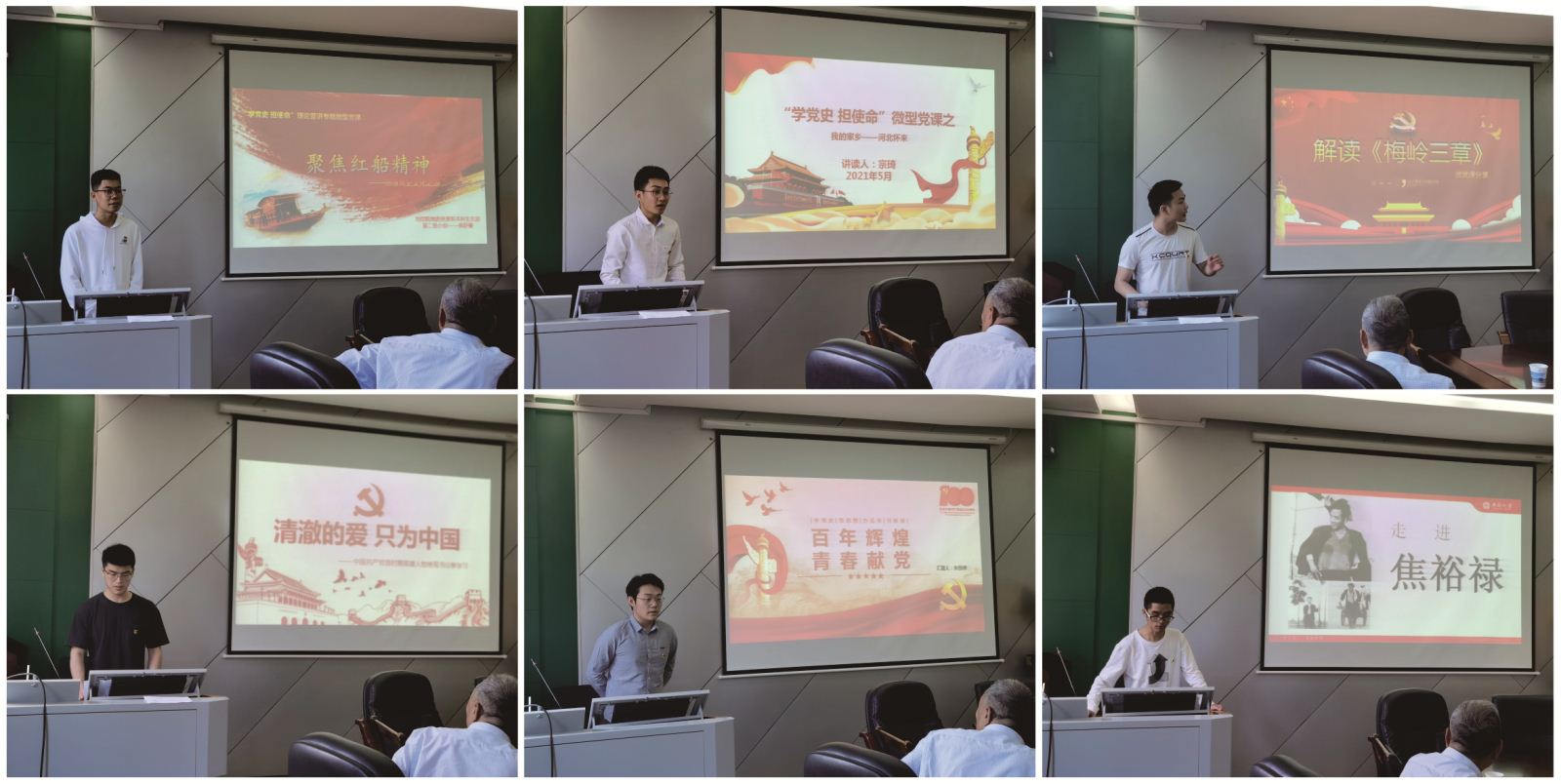 在主持人宣读完比赛规则后,地质工程系硕士生支部书记刘飚老师和院团委书记刘琦老师作为教职工代表进行了表演展示。随后,来自各个学生支部的参赛同志们都依次上台讲解了微党课。此次微党课作品内容丰富,有对彭德怀、陈毅等老一辈无产阶级革命家故事的解读,也有对自己家乡党史故事的剖析,还有围绕戍边英雄事迹以及热播剧《觉醒年代》中陈延年和陈乔年两兄弟展开的分享。地信院关工委常务副主任胡祥昭老师从活动组织、党课题材、故事内容等方面对此次活动进行了点评,对参赛选手们的精彩讲授予以了肯定,他鼓励参赛的党员们通过此次活动提升自身理论水平,掌握更多为民服务的本领,在今后的学习生活中取得新的更大成绩。