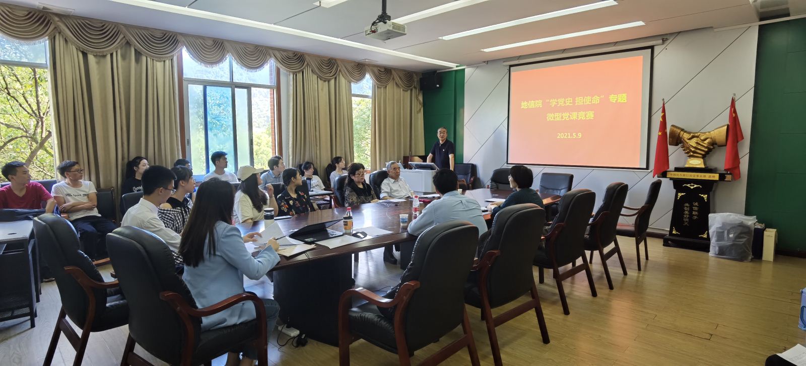 开展党史学习教育的实施方案》相关安排,地信院党委针对全院学院教工、学生党支部,于5月9日上午在校本部地学楼开展了“学党史 担使命”理论宣讲专题微型党课竞赛(决赛)活动。出席本次竞赛活动的有院党委书记邵拥军、院党委副书记兼关工委主任李建军、院关工委常务副主任胡祥昭、院关工委委员匡华凌、院研究生辅导员田可、院地质工程系硕士生支部书记刘飚、院团委书记刘琦。竞赛由地质资源系本科生党支部杨晨雨主持,来自学院各个党支部的党员代表现场观赛。