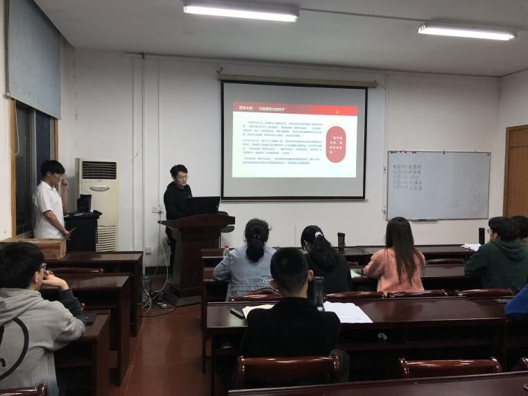 活动开始,各党小组分别派出代表依次进行微党课展示。其中,段新明同志以杨善洲、马宝祥同志的故事引出党员和旗帜的关系;郝舒蕃同志以油画《启航》为引子,重温红船精神,他分别从红船精神的内涵、为什么弘扬红船精神和作为大学生党员该怎么做三个方面解读了红船精神;何玲同志讲述了“军爱民、民拥军”的宁夏六盘山黄河水的故事,中国共产党为了让“老百姓吃不带泥的土豆”进行了艰苦的奋斗,让天旱、窖枯、水断流成为了宁夏西海固的过去时;陈煜东同志详细介绍了党在思想上的重要转折点—古田会议的故事;朱恒睿同志以三个“百年”展开课程,带领大家回顾过去、总结现在、展望未来。