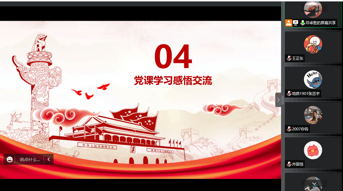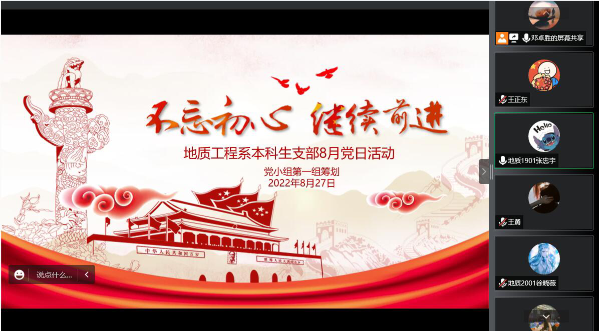 8月27日晚上19:00,地质工程系本科生支部8月党日活动以线上腾讯会议的形式顺利召开,支部书记杨通田、支部全体同志参加本次支部大会。会议由第一党小组组长邓卓胜同志主持。