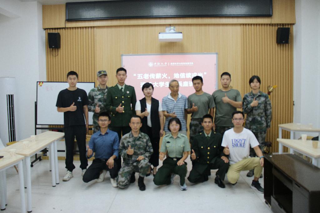 随后,座谈会展开自由交谈,由退伍大学生提出生活、学习中遇到的部分问题,在场的老师们体贴细致地进行解答。杨通田老师又进一步深入阐述了退伍大学生的相关优惠政策,打消了同学们的困惑。紧接着,胡祥昭教授向同学们提出了自己的期盼。胡祥昭教授回顾了自己的军旅与求学的故事,强调从戎经历对锤炼人生有重要意义,并谆谆教诲同学们保持军队作风、适应学习、取长补短,希望同学们发扬戎光、不负嘱托。最后,胡幽老师发言,鼓励同学们将军旅生活转化为学习生活上的坚韧与成熟,不断加强自身素养,成为更加优秀的栋梁之才。语毕,在场的所有人合影留念。