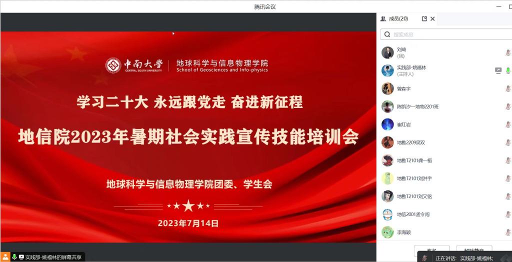 2023 年暑期社会实践宣传技能培训会于线上“腾讯会议”顺利开展。此次培训会由学院分团委书记刘琦老师主讲,姚福林同学主持,学院各校级暑期社会实践团队参会。