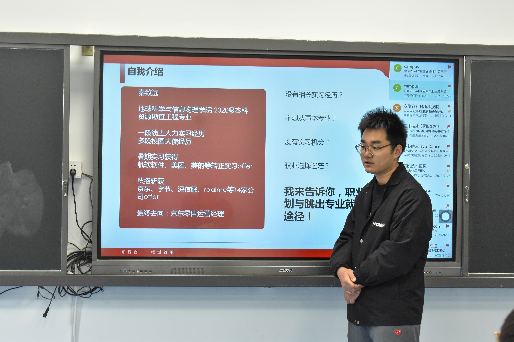 为帮助同学们在众多机会中找到匹配自己兴趣和专业发展的校外实习,地信院团委、学生会、研究生会于3月20日在新校区A座203开展了“极地漫谈”青年成长沙龙系列活动之“大学生校外实习攻略”经验分享会。本次活动邀请了获京东、字节跳动、海信集团、潍柴动力、奇瑞、中铁八局、万华化学、真我等14家知名企业OFFER的探花社区
