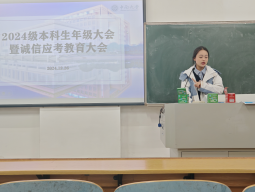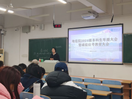 为强化学生的诚信意识,加强学风建设,营造公平、公正、诚信、文明的考试氛围,在期末考试来临之际,12月26日晚,地信院于新校区B座112和319教室,召开2024级本科生期末诚信应考教育大会,辅导员寇浚哲、王爽爽老师主持会议,学院2024级全体学生参加会议。
