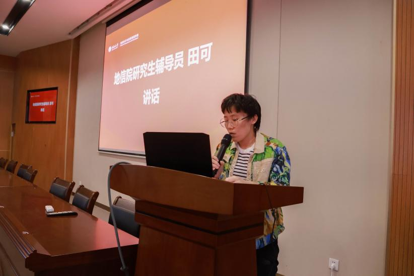 会议伊始,地信院研究生辅导员田可老师上台致辞。田可老师指出,社会实践活动与共青团的发展以及广大青年之间有着密切联系,是大学生了解社会,认识国情,增长才干,增强社会责任感的重要途径。她强调此次答辩会旨在总结实践经验,帮助同学们学习实践活动,为更好地开展实践活动打下坚实基础。最后,田老师希望同学们能够牢记习近平总书记的嘱托,不负韶华,不负时代,不负人民,在青春的赛道上奋力奔跑,争取跑出当代青年的最好成绩。