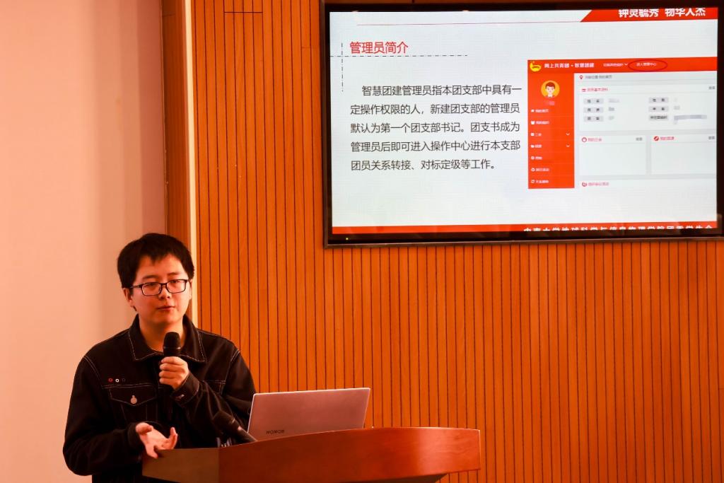 随后,韩世博同学围绕团支书工作职责与《团支部工作手册》填写注意事项展开讲解。内容包括基层团组织建设、团支部手册相关要求、团支部考核细则、智慧团建常用功能等。