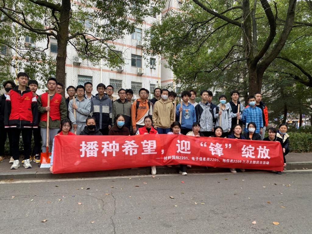 地信类2208团支部、电子信息类2205团支部和材料国际2201团支部联合组织的“播种希望,迎‘锋’绽放”三月学雷锋植树志愿活动在探花社区