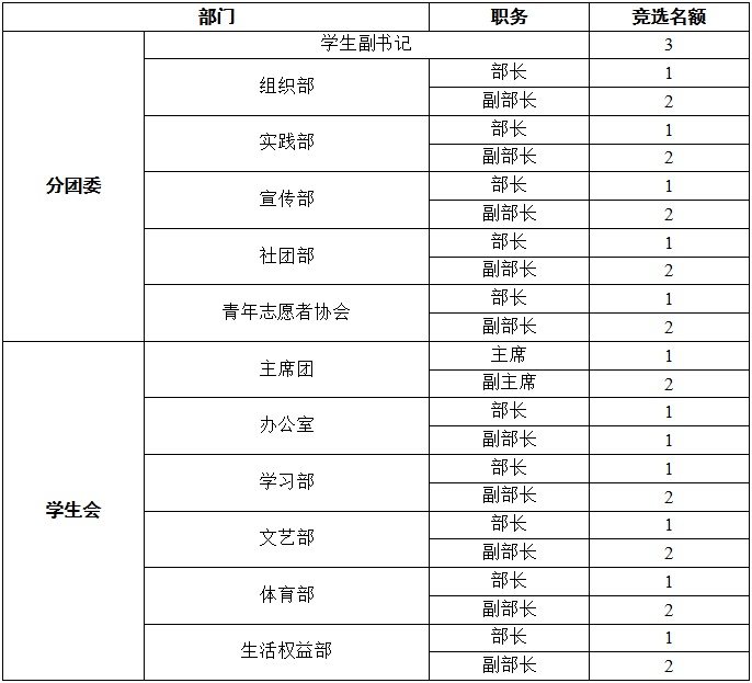 请意向参选的同学自行下载报名表(见附件),请勿自行变更表格格式和页数,于7月3日中午12点前将电子版表格发送至指定邮箱:[email protected]。请注意,邮件主题及文件名请以“干部竞选+竞选类别(主席团/学生副书记/部长团)+班级+姓名”命名备注。
